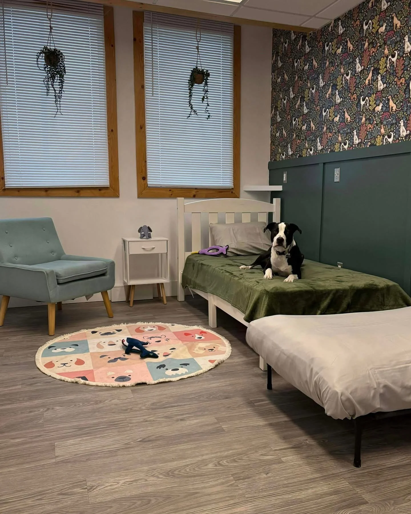 Each large suite features cozy home-like furnishings, night lights, sound machines, toys, security cameras, and individual temperature and CO₂ sensors for unmatched comfort and peace of mind.